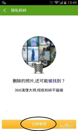点击【立即使用】按钮,即可启动360清理大师这款强力手机清理工具。使用该应用清理手机后,可有效避免已删除的照片被恢复。
