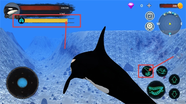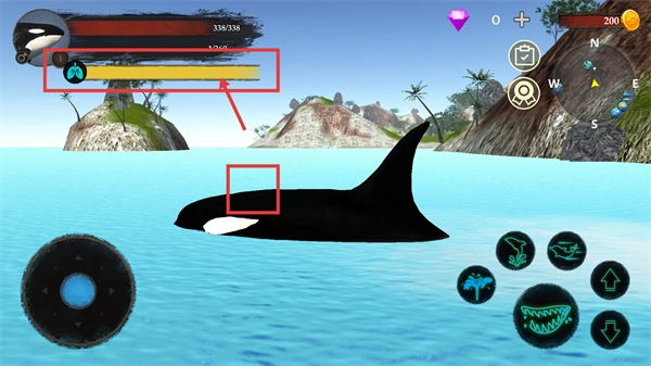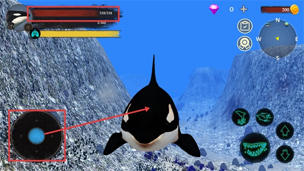 2、利用左侧的【摇杆】来操控虎鲸的移动方向,同时留意左上角显示的【338/338】生命值与氧气条数值,保证自身状态平稳,以便能够持续地探索这片海域。
