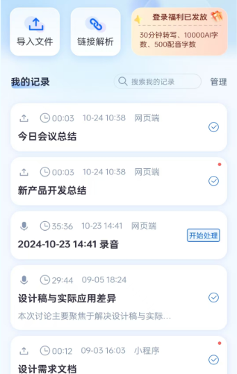 1. 录音转文字功能:支持实时录音转写文字,也可导入已有的音频文件进行文字转换。