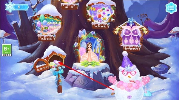 1、启动莉比小公主之冰雪派对游戏,进入主界面,主界面包含堆雪人、制作捕梦网、美甲、装扮会场等多种玩法,随后点击制作卡片选项;