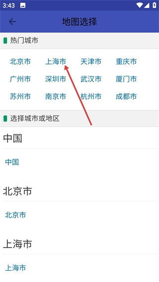 2、在地图选择页面选择目标城市,如“上海市”。