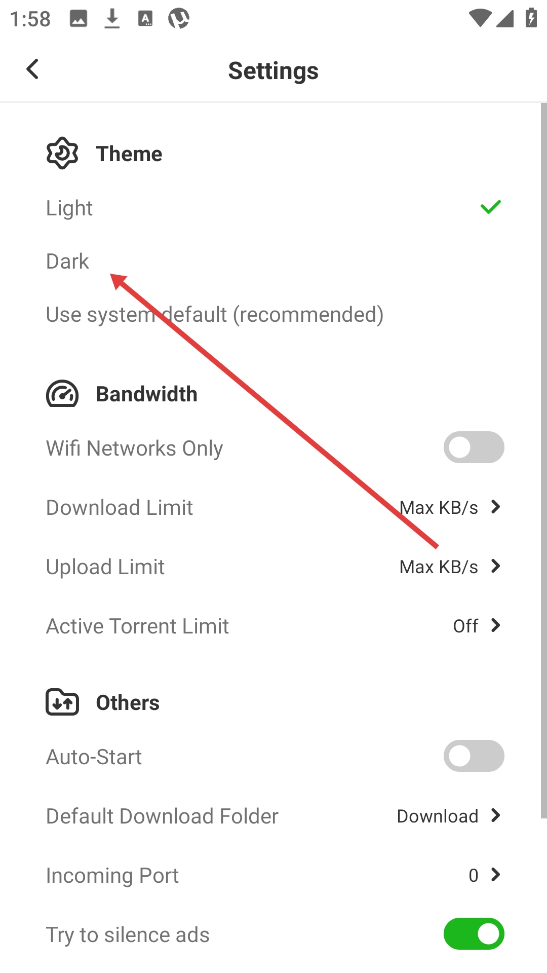 3、在设置页面中点击【Dark】,将主题切换为深色模式。