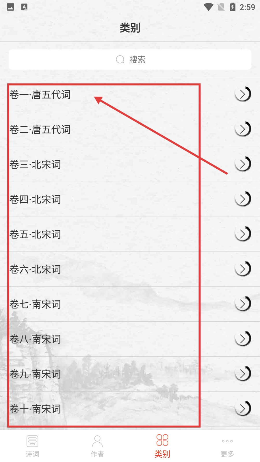 在类别界面,能够挑选唐五代词、北宋词、南宋词等不同朝代的词卷,点击即可进入查看具体的诗词列表。
