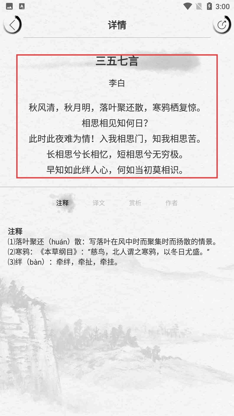 在诗词详情页面,用户不仅能浏览诗词原文,还能通过注释、译文、赏析以及作者介绍等板块,更深入地领会诗词的内涵。