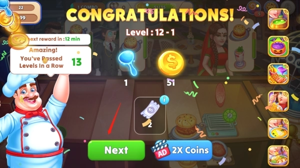 2、以12-1关为例,该关卡的通关条件是玩家需从7位顾客那里赚取35枚金币。