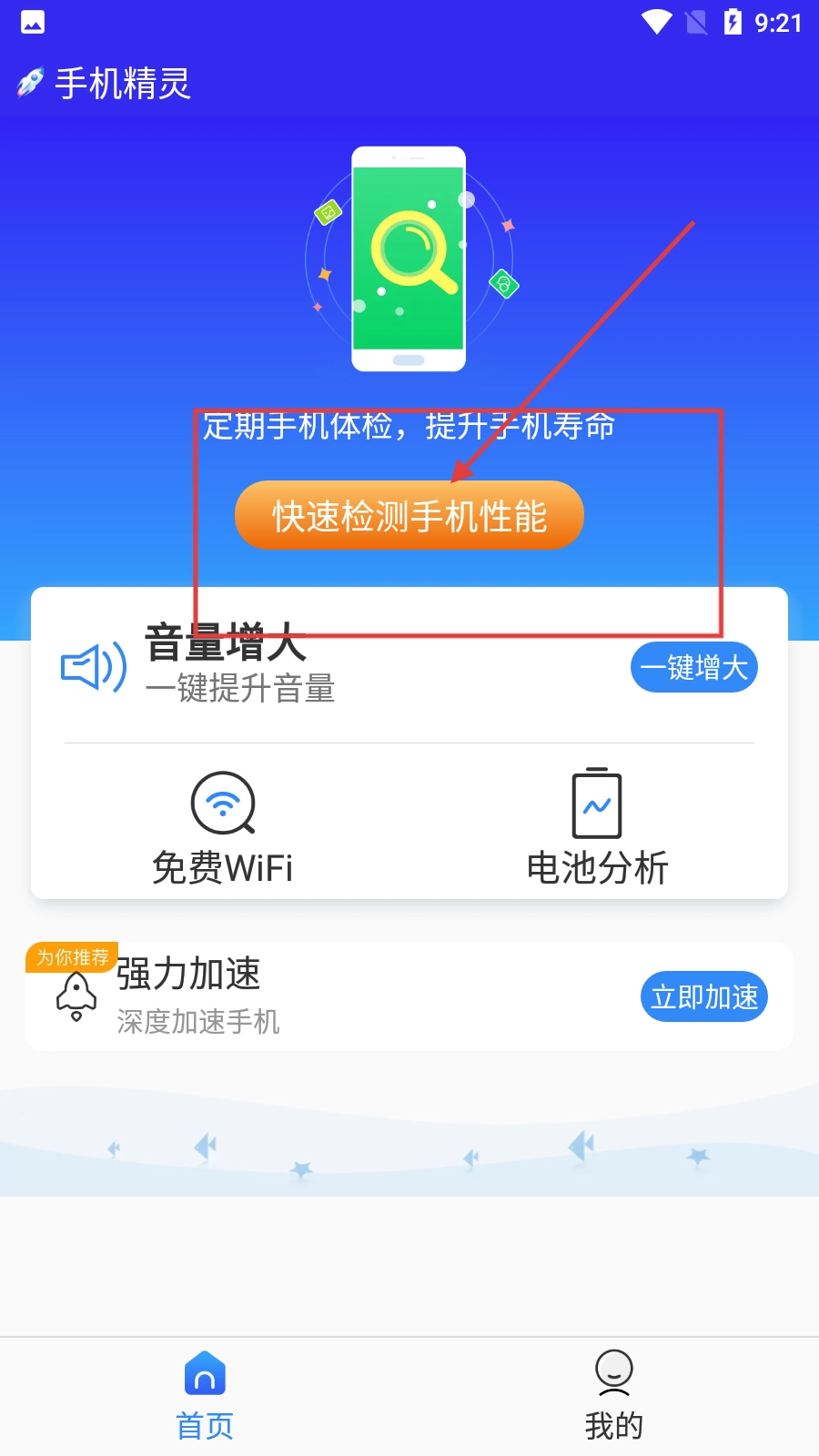 1、进入【手机精灵】的首页后,点击【快速检测手机性能】按钮,就能启动手机性能检测流程。