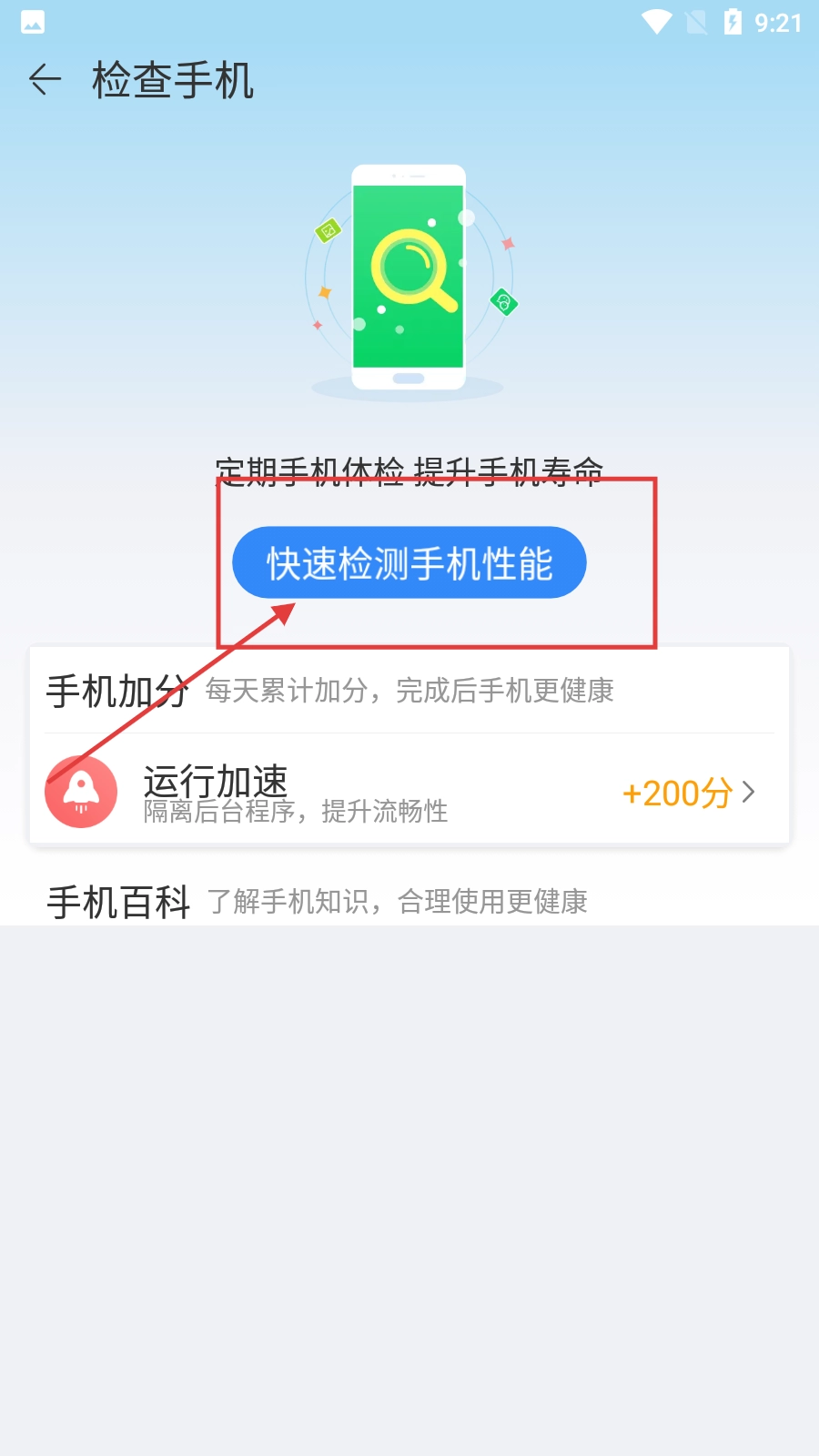 进入检查手机的界面后,再次点击【快速检测手机性能】按钮,就能启动手机性能检测流程。