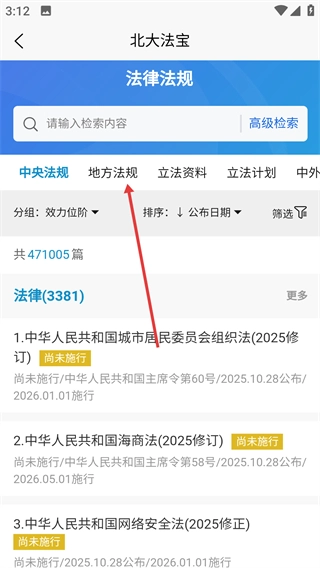 2、进入法律法规页面后,点击【地方法规】分类选项,即可查看相关的地方法规内容。