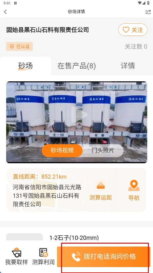 4、进入砂场详情页面后,可点击【拨打电话询问价格】功能按钮,咨询砂场产品的具体价格。