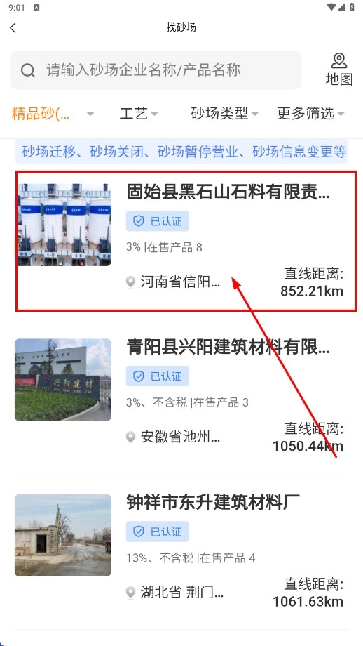 2、进入找砂场页面后,筛选条件选择【精品砂(山料)-产品类型】这一项。