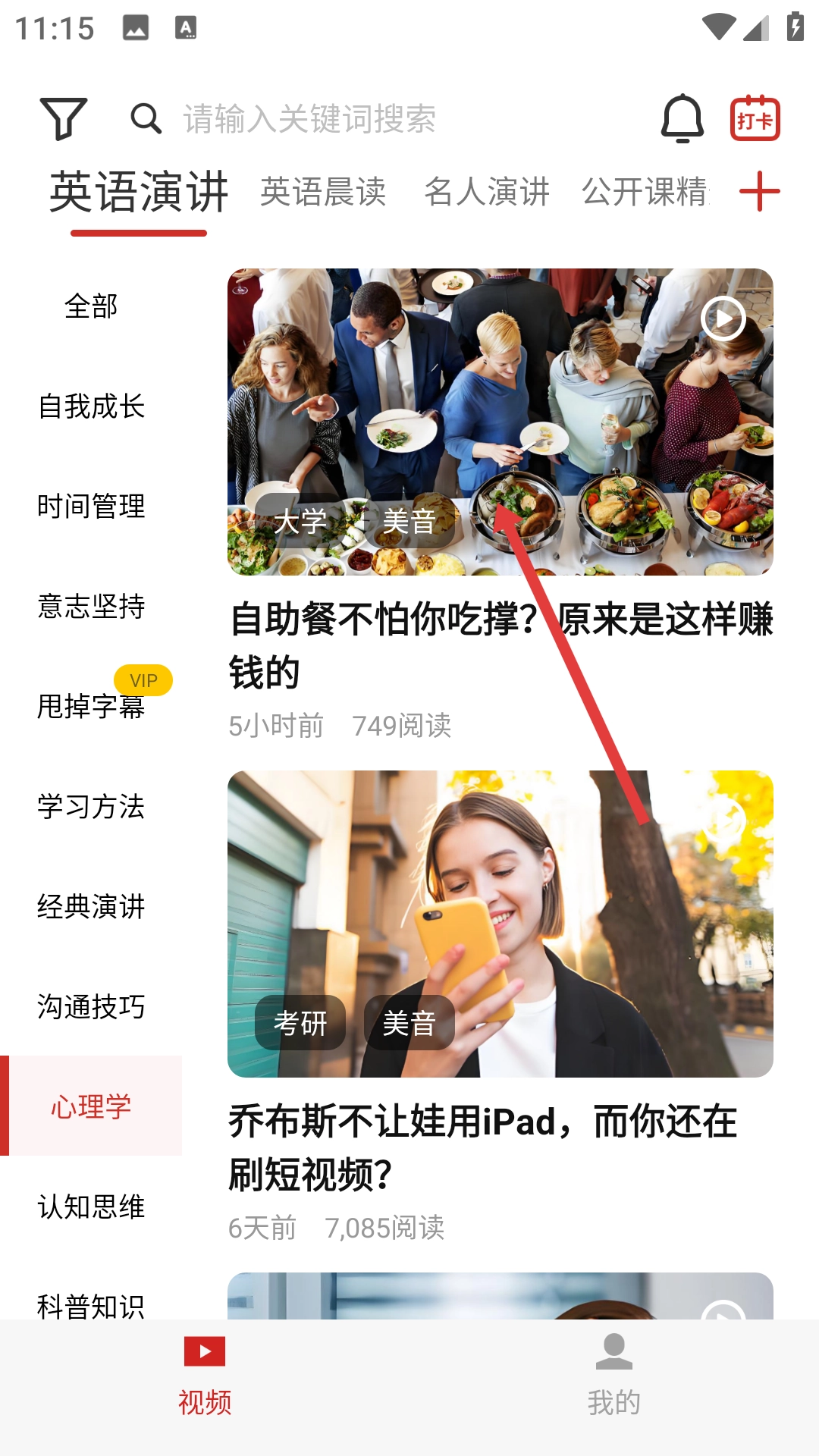 1、在软件视频页面,点击左侧【心理学】分类,筛选出心理学相关英语视频内容。