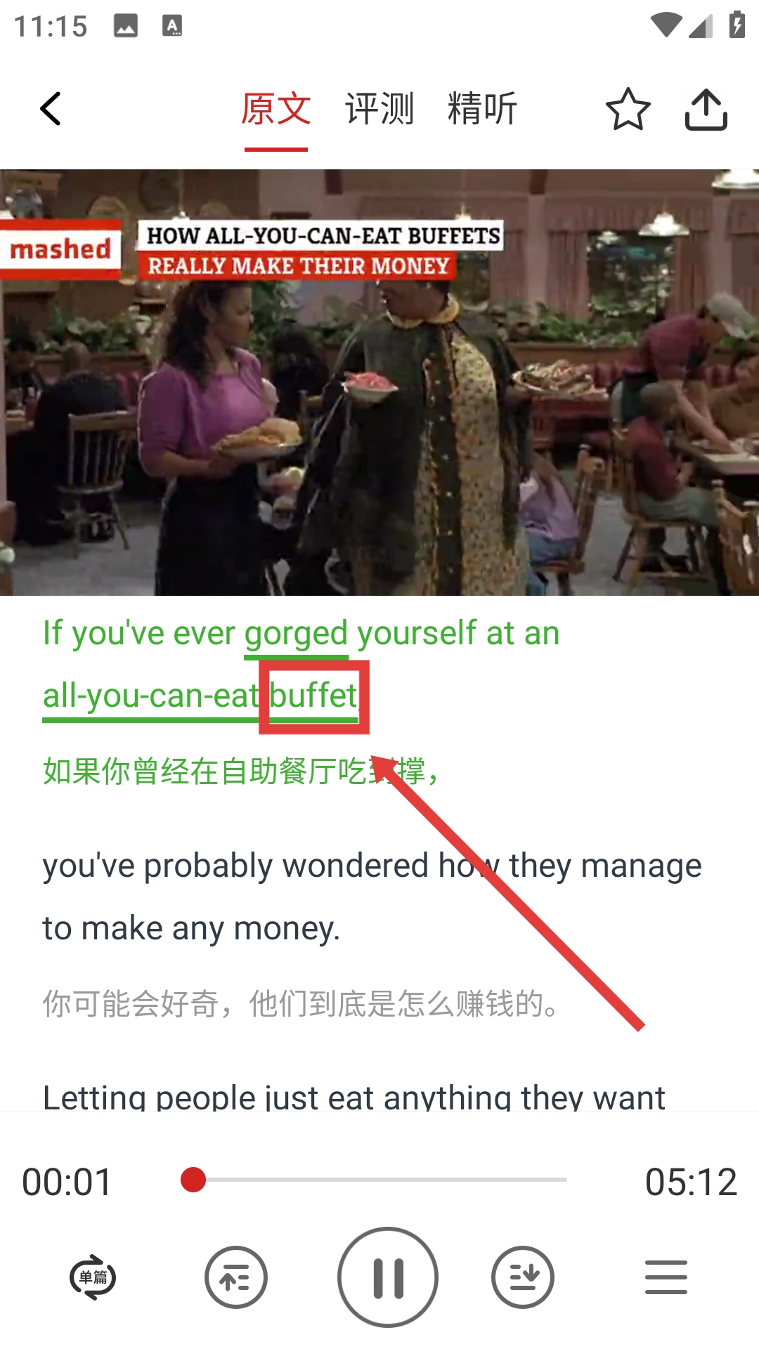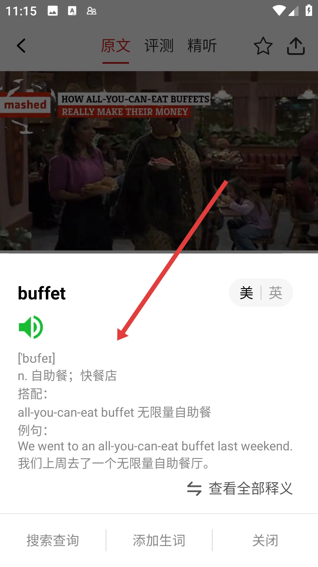 3、在视频播放页面,点击文中需查询的单词,如【buffet】,查看其释义。