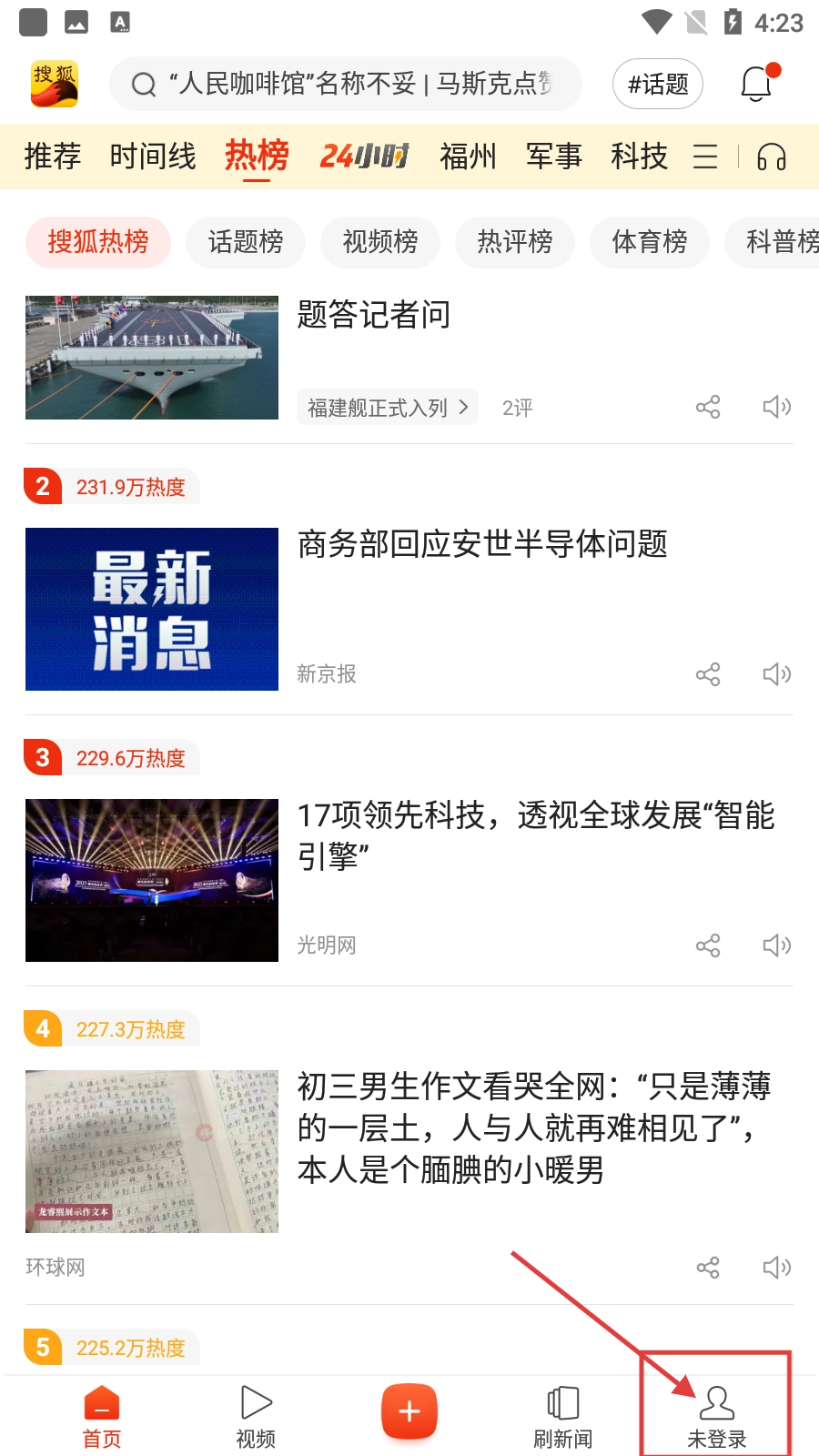 1、打开【搜狐】,进入首页后可浏览热榜新闻,点击右下角【未登录】进入个人页面。