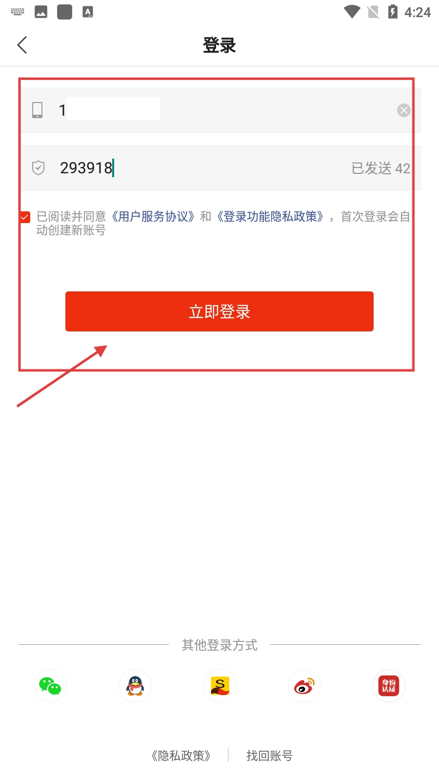 3、输入手机号和短信验证码,勾选同意协议后点击【立即登录】完成登录。