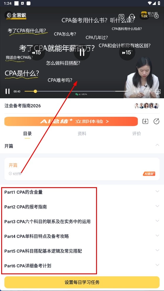 4、观看CPA备考课程时,可根据【课程目录-板块】的章节,有针对性地学习备考内容。