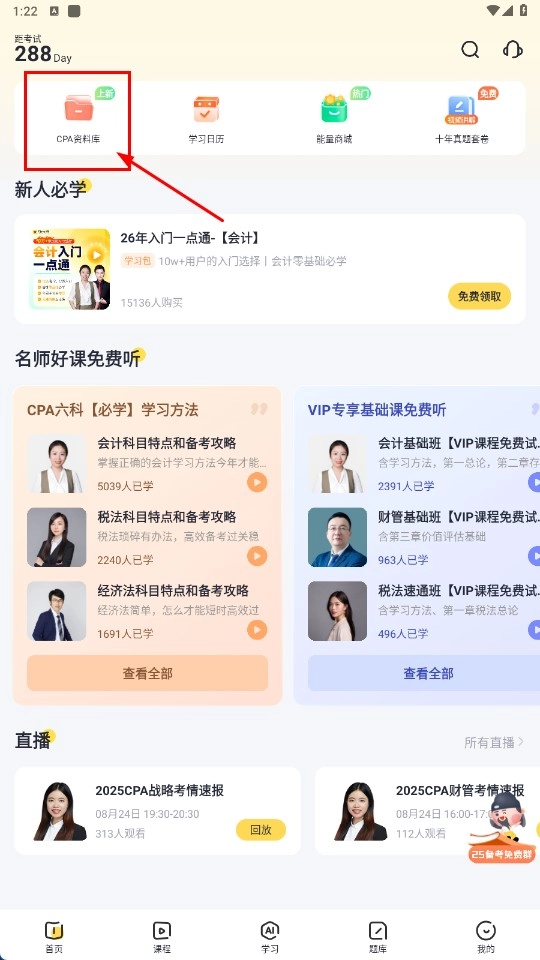 1、点击【CPA资料库-功能入口】,进入资料板块。