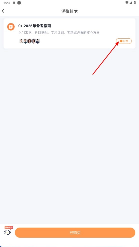 3、进入课程目录,点击【听课-按钮】,开始学习“2026年备考指南”课程。