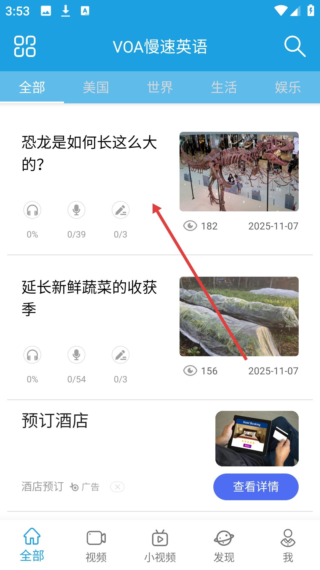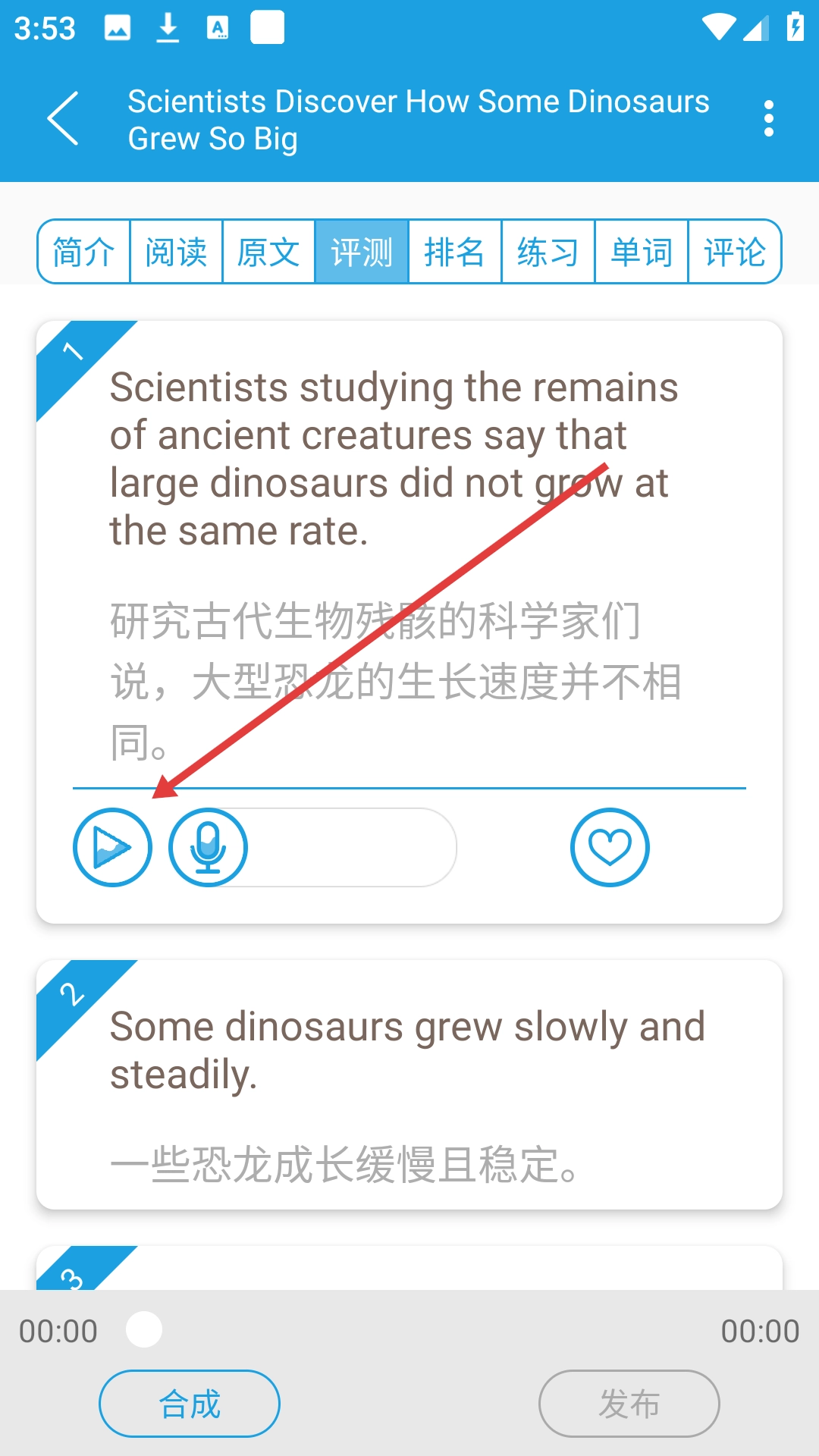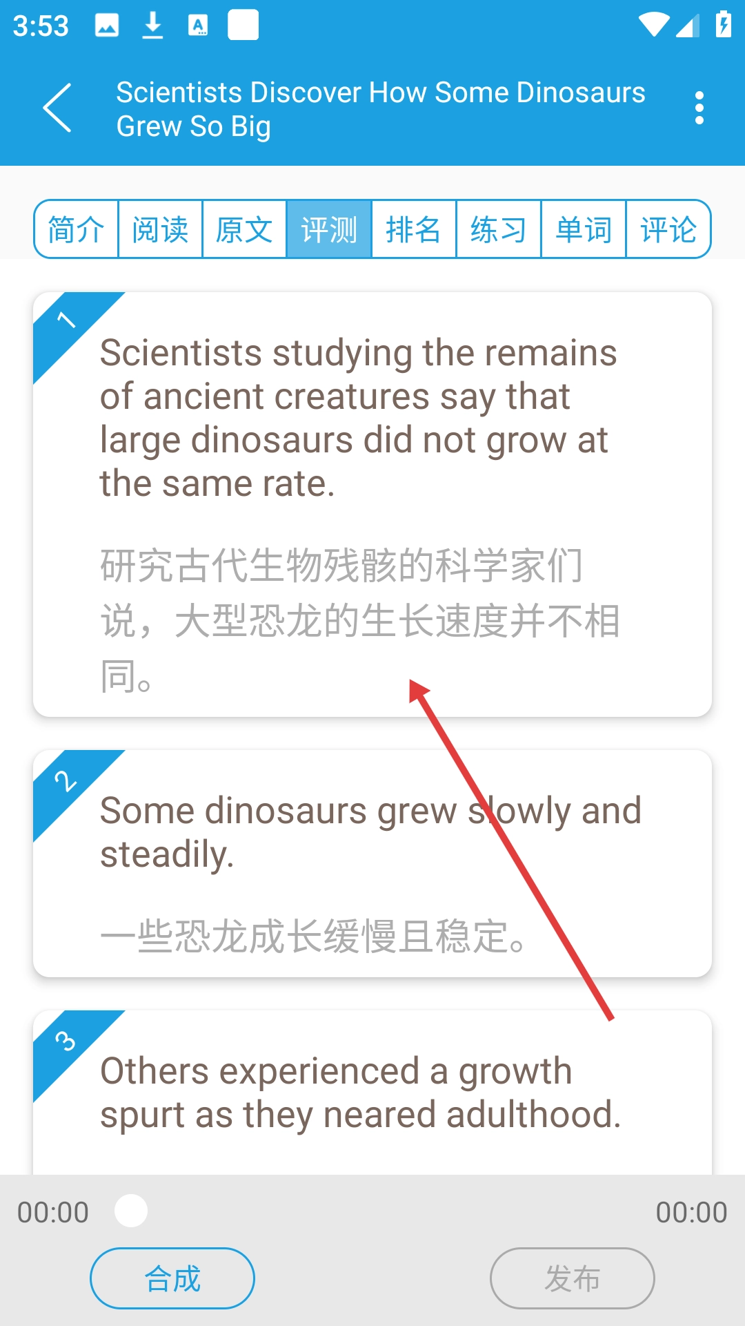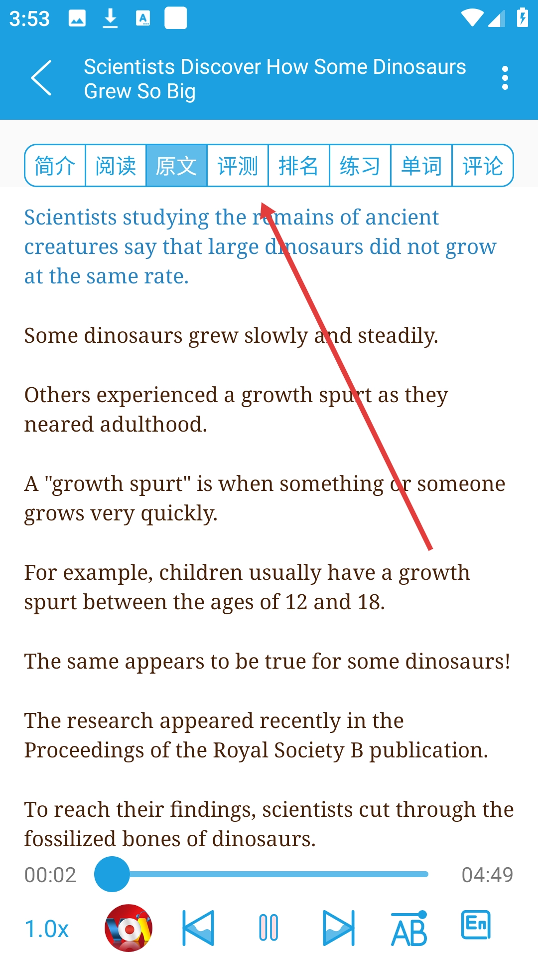 1、点击要学习的文章,如【恐龙是如何长这么大的?】,进入文章学习页面。