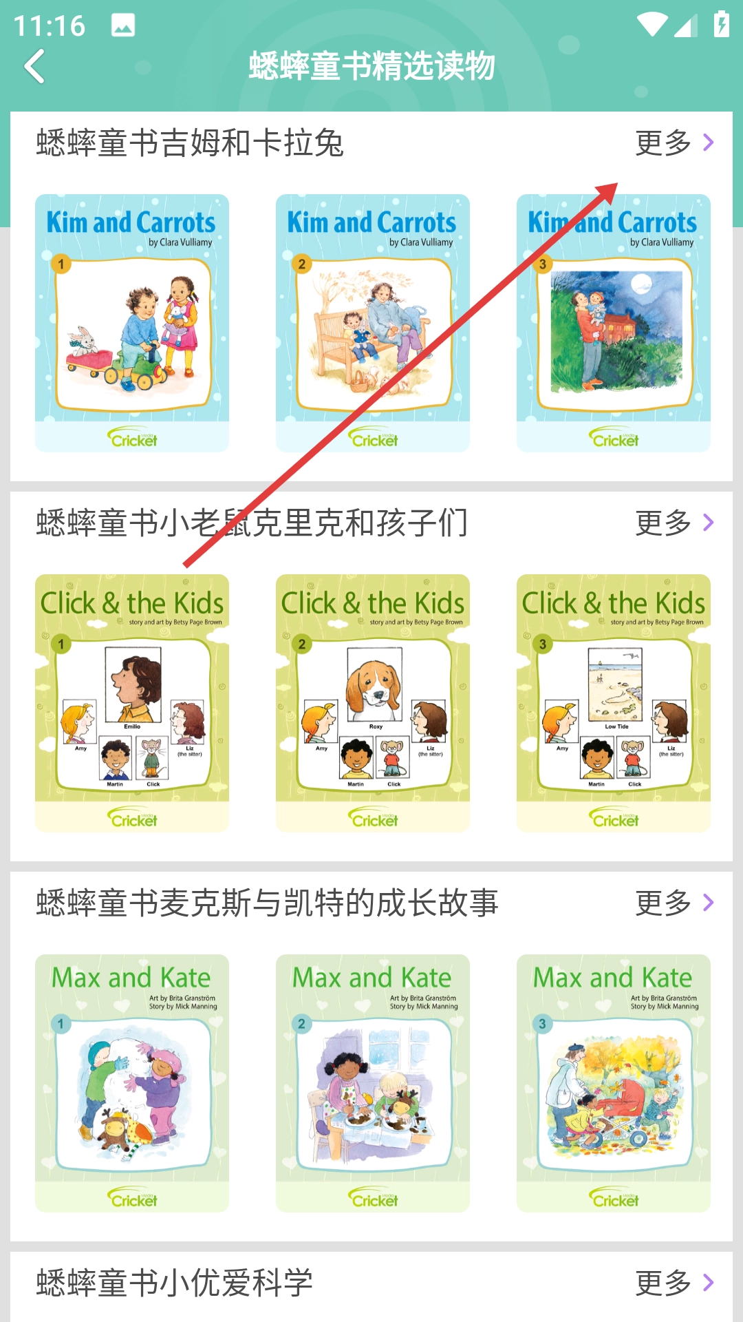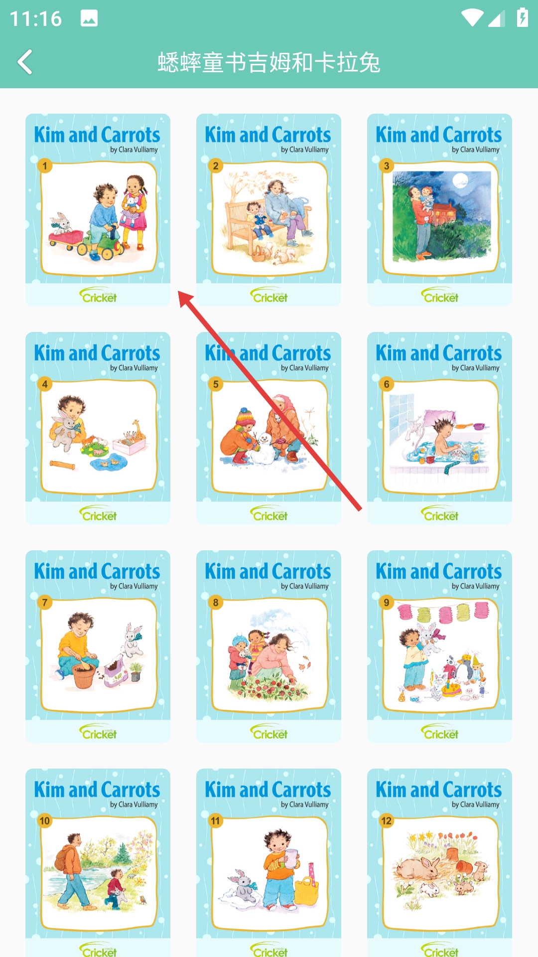 3、在蟋蟀童书页面挑选想要阅读的书籍,像【KimandCarrots】系列就可以。