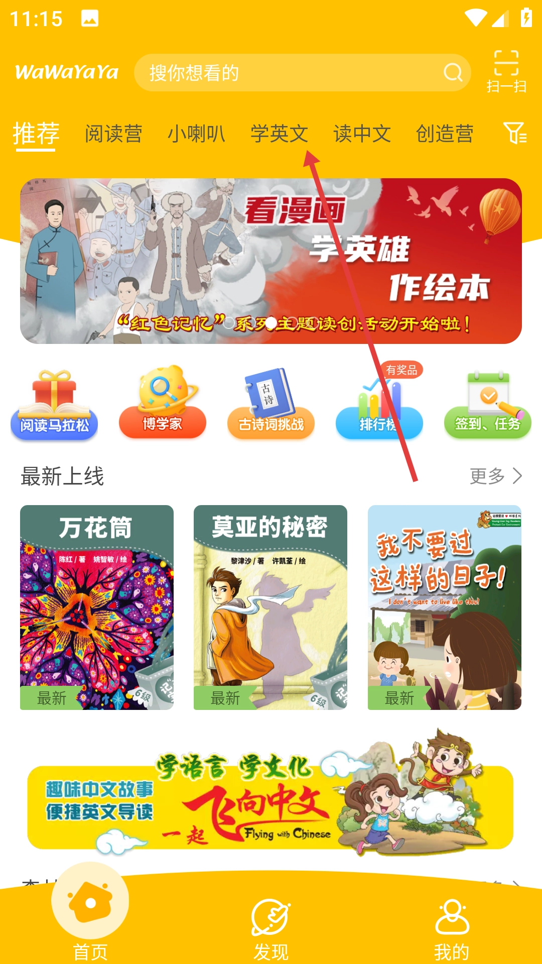 1、打开WaWaYaYa应用后,找到并点击【学英文】选项,即可进入对应的学英文页面。
