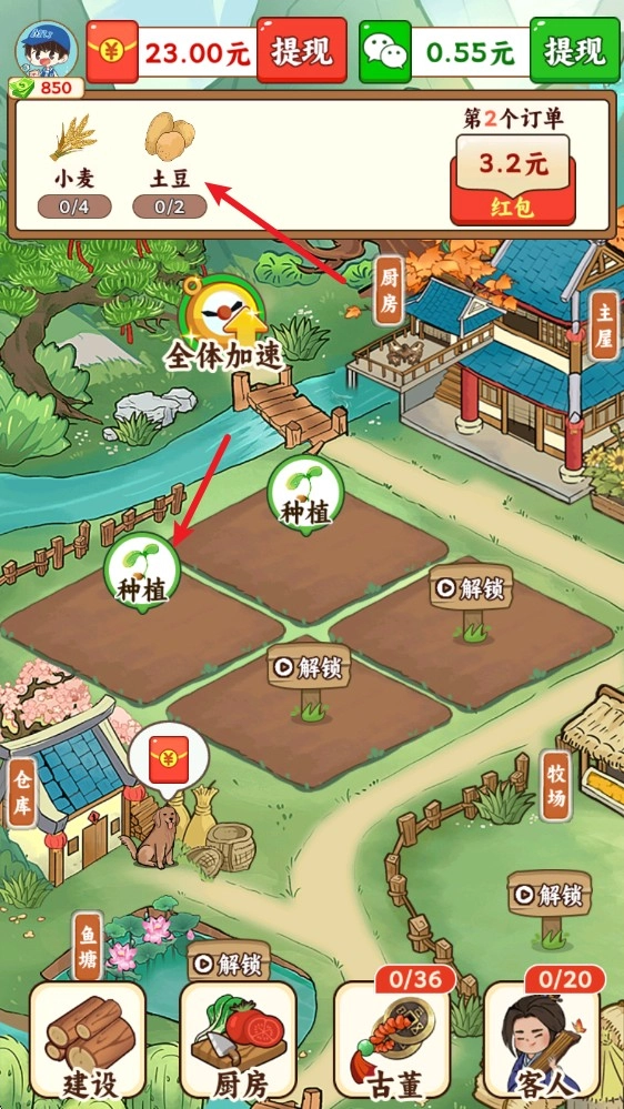 在游戏里,我们点击顶部的订单就能看到种植目标,接着点击下方的空地就可以开始种植了。