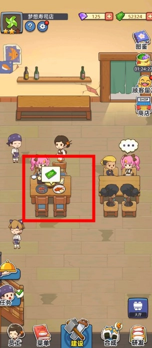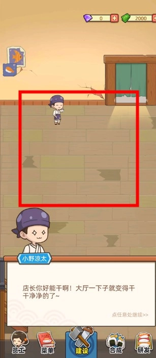 进入游戏后,和伙伴凉太一起打理寿司店。先把店铺卫生打扫干净,接着采购桌椅与厨房设备,最后点击【建设】按钮,就能完成初始设施的布置了。