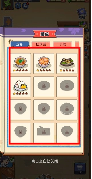 按照游戏教程一步步操作,中途暂停去开包厢,把攒下来的资源都用来升级那些销量高的菜品和饮品。