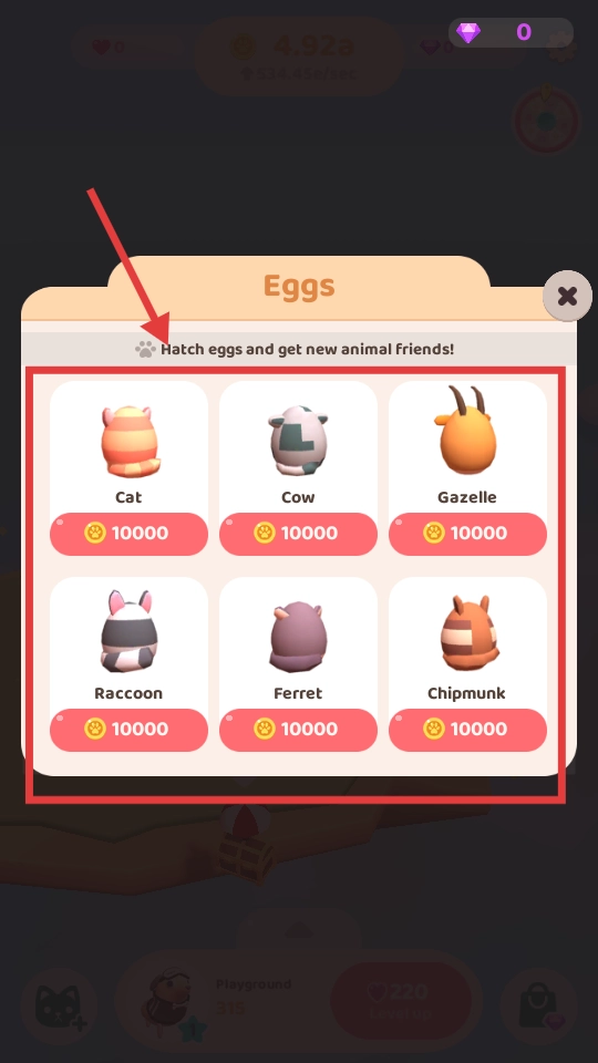 3、消耗10000金币,孵化Cat、Cow等动物蛋,解锁新伙伴。