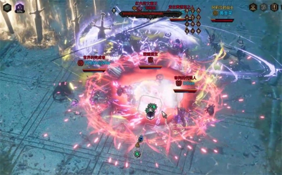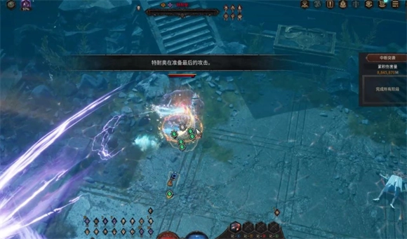 7、两个全屏范围伤害技能释放完毕后,会固定衔接最后一个技能——审判之光会从地图边缘由外向内呈环状落下,颜色包含白金色与黑紫色。这个机制的效果似乎是一旦命中,就会将你的减益效果直接叠满或清空,进而触发秒杀,无论多少生命值都无法抵挡。躲避的技巧是先与BOSS保持近距离站位,因为最靠近BOSS的那一圈审判之光会延迟零点几秒才落下,抓住这个短暂的时间差使用位移技能向外脱离,就能避开该机制。之后BOSS会进入气绝倒地状态,此时上前进行最后一击即可完成战斗。