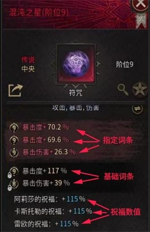 2、混沌之星(球),球的阶位在3到9之间(不包含5阶)。其中3阶球较为特殊,它只能通过主线任务获取,仅提供祝福数值,自身没有任何词条;4阶及以上的球才会带有词条。4阶和6阶球各有2个基础词条,前缀和后缀分别一条。7阶、8阶、9阶球则在2个基础词条的基础上,依次额外增加1条、2条、3条指定词条。