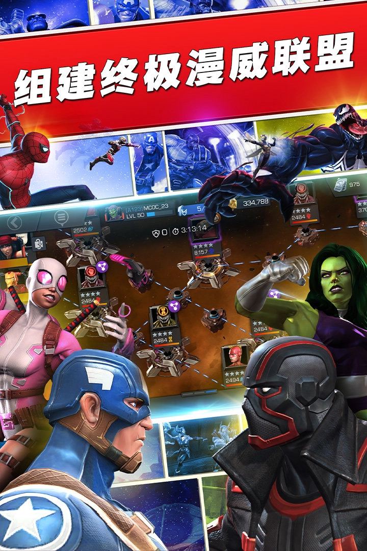 蜘蛛侠、钢铁侠、美国队长等诸多经典漫威人物一一登场!强大的超级英雄阵容,开启终极漫威冠军之旅