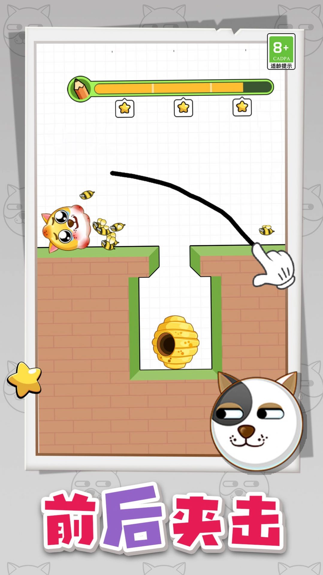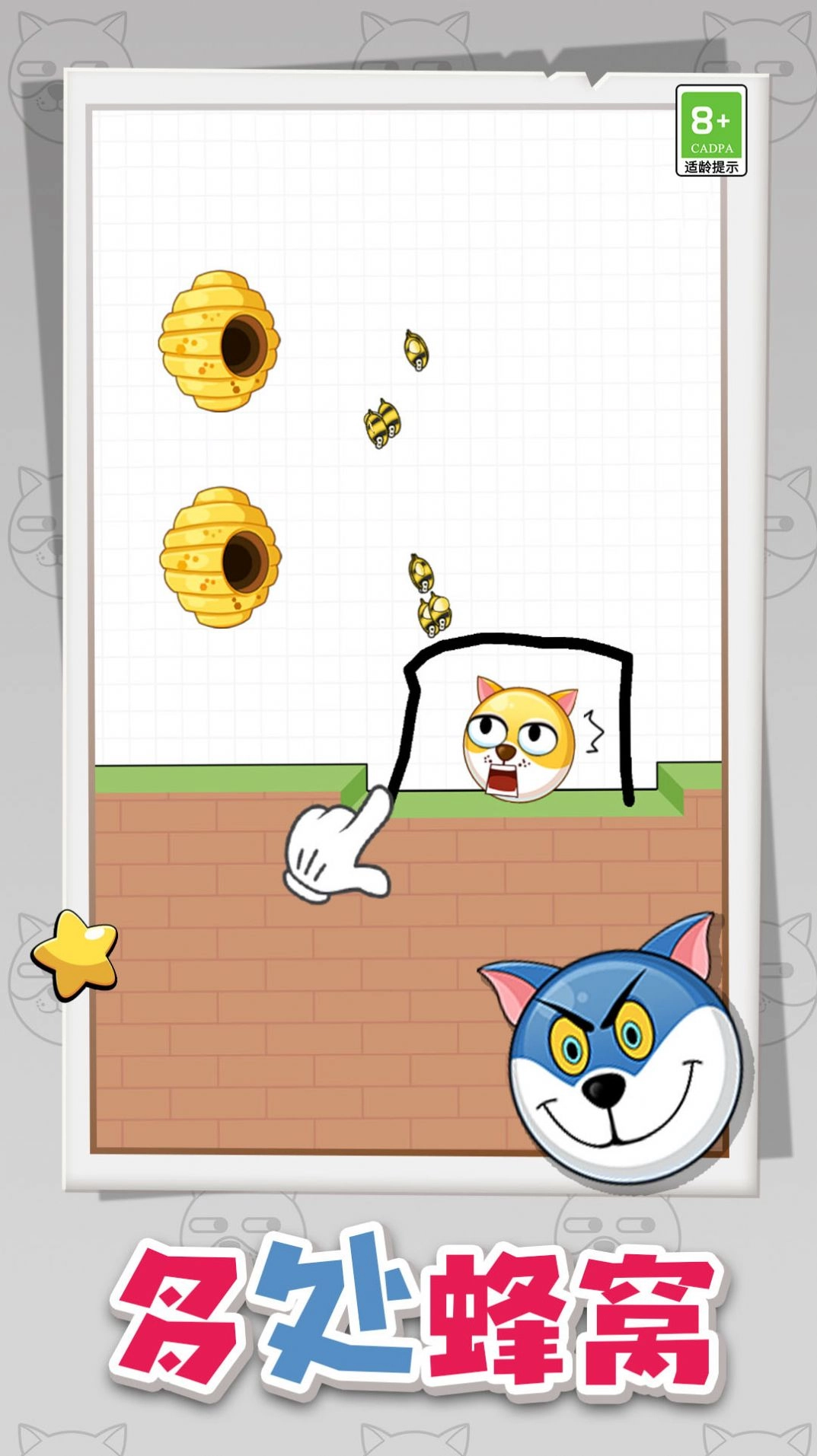 通关方法:画一个半圆形的圈,将狗狗圈在里面,这样蜜蜂就蛰不到狗狗了。