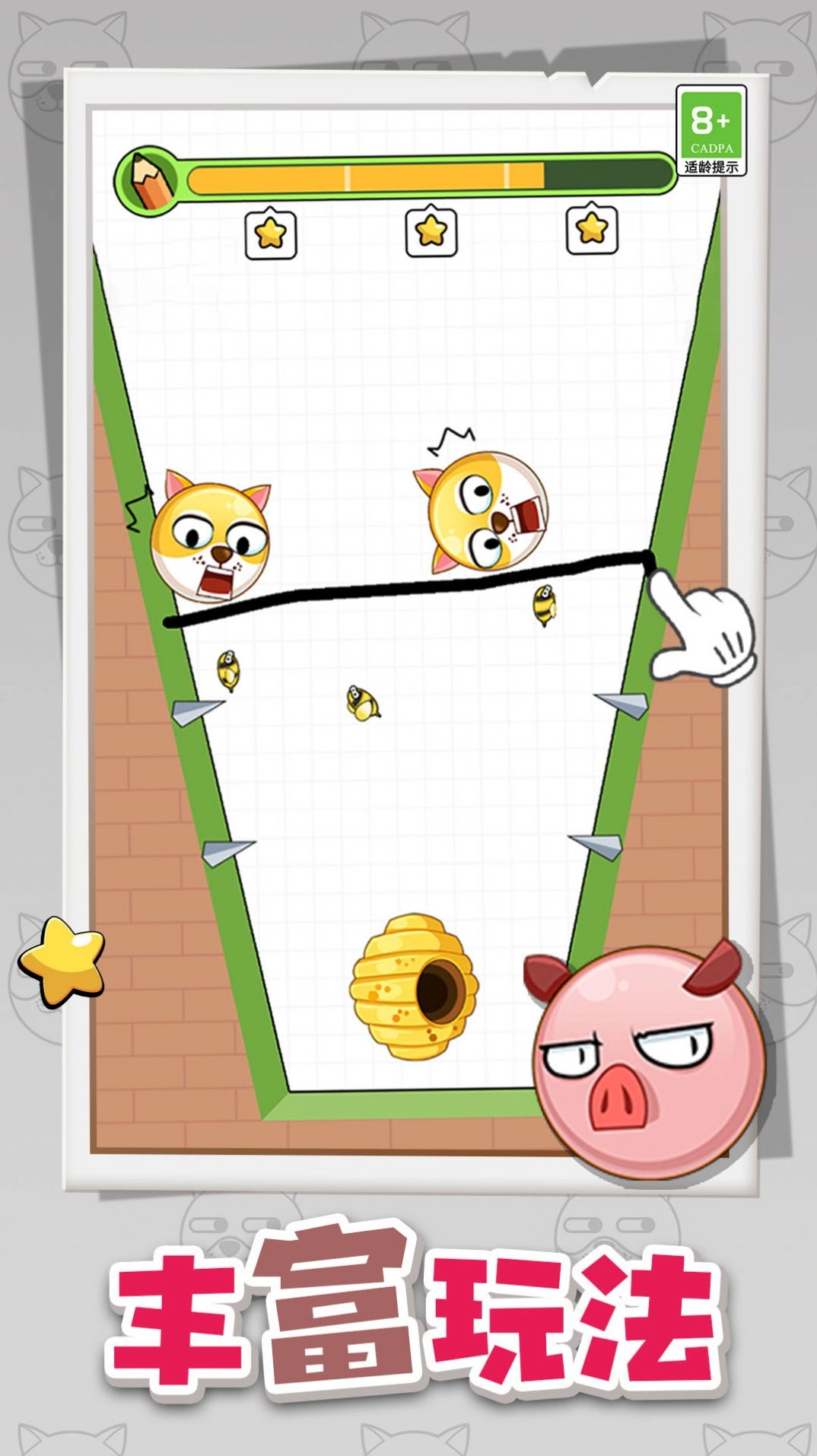 一款趣味性十足的画线解救游戏,玩家们会在游戏中协助可怜的狗狗对抗蜜蜂,这儿拥有十分多给力的难关等你去玩,给你带来从未有过的烧脑体验感,各种难题等你去解决,每一关都是张狂感十足的应战,所有的试炼玩法都是十分不错的。这儿能够自在感受不同的玩法趣味,诸多使命,纵情应战,每种都会给到玩家们不同的体验,锻炼脑力,益智闯关,每道关卡,都需要不同的画线方法,才干成功通关,不断进行应战,完成更多的使命,收获奖励,欢喜无限。