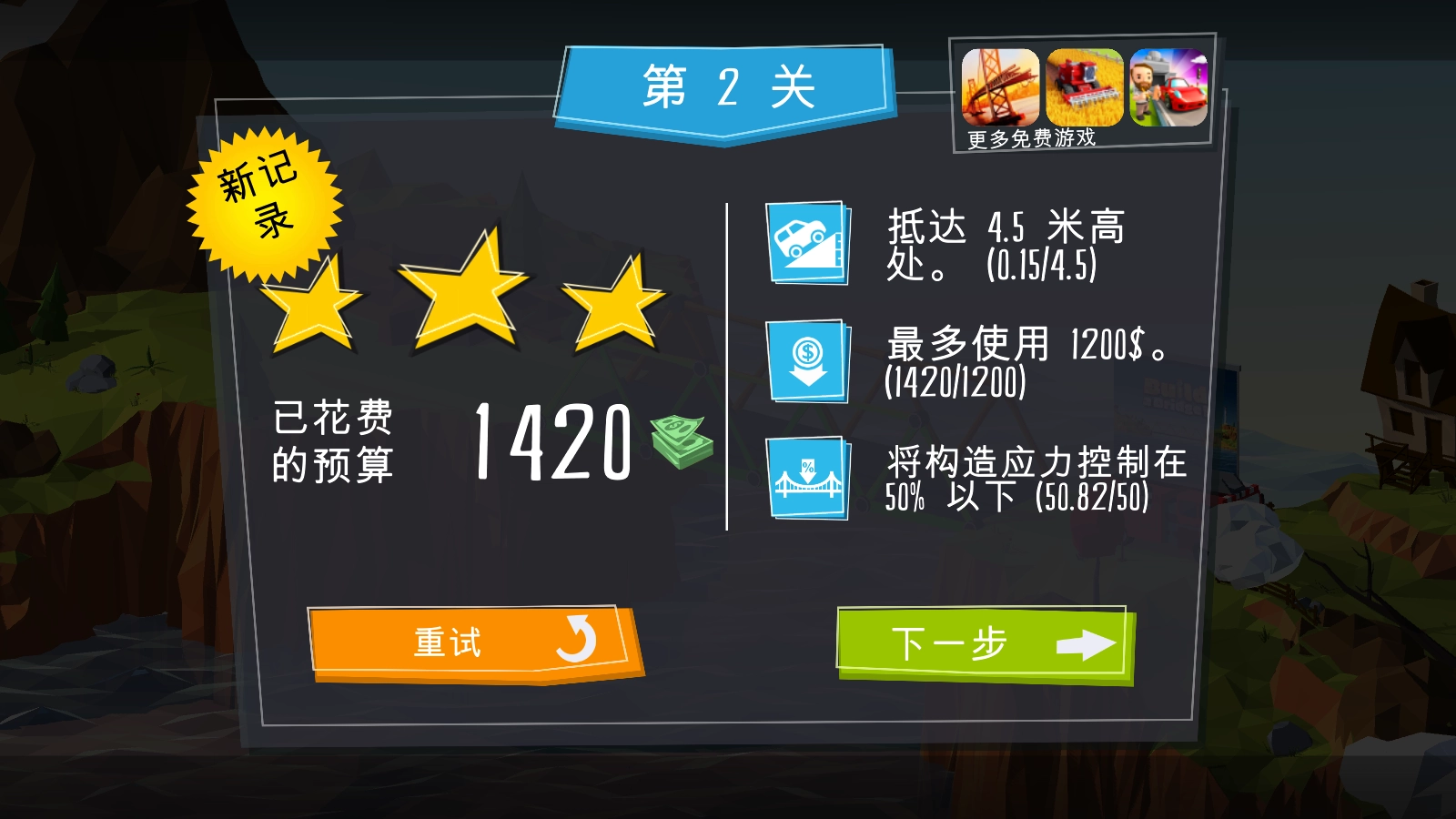要留意避免浪费材料,每一个关卡都设有严格的预算限制,尽量把资金用在关键之处,凭借最低的预算打造出最优质的桥梁。