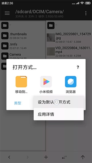 5、要是您平时习惯用某一个视频播放器,不想每次打开视频前都得选择打开方式,那可以长按这个播放器的打开选项,把它设为默认。