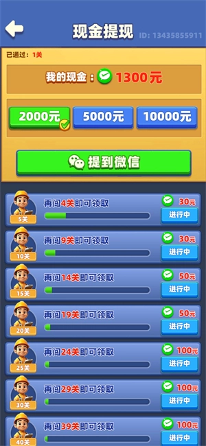 微信现金奖励仅能通过指定关卡获取,积累到一定金额后即可申请提现。