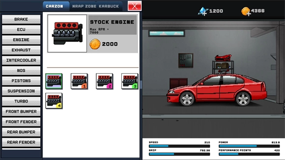 在主界面点击Garage,接着点击carzon,就能使用金币购买各类车辆配件以进行改造。