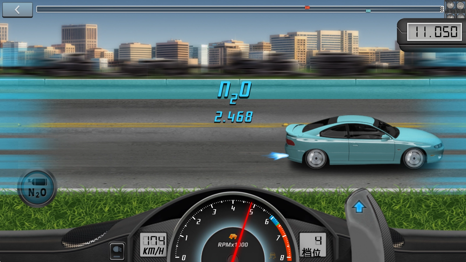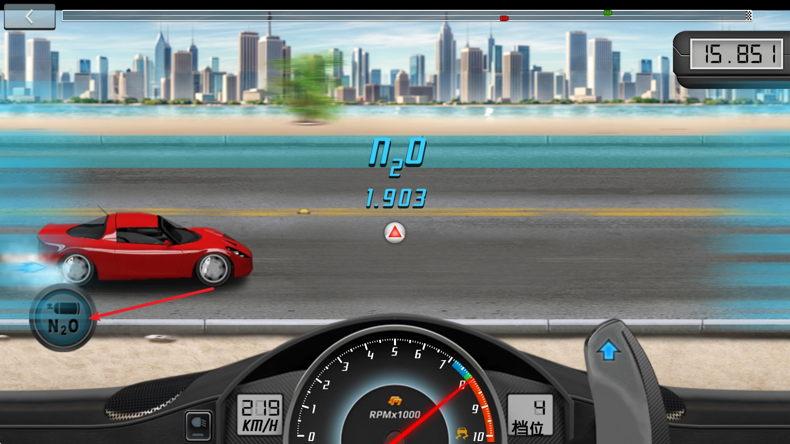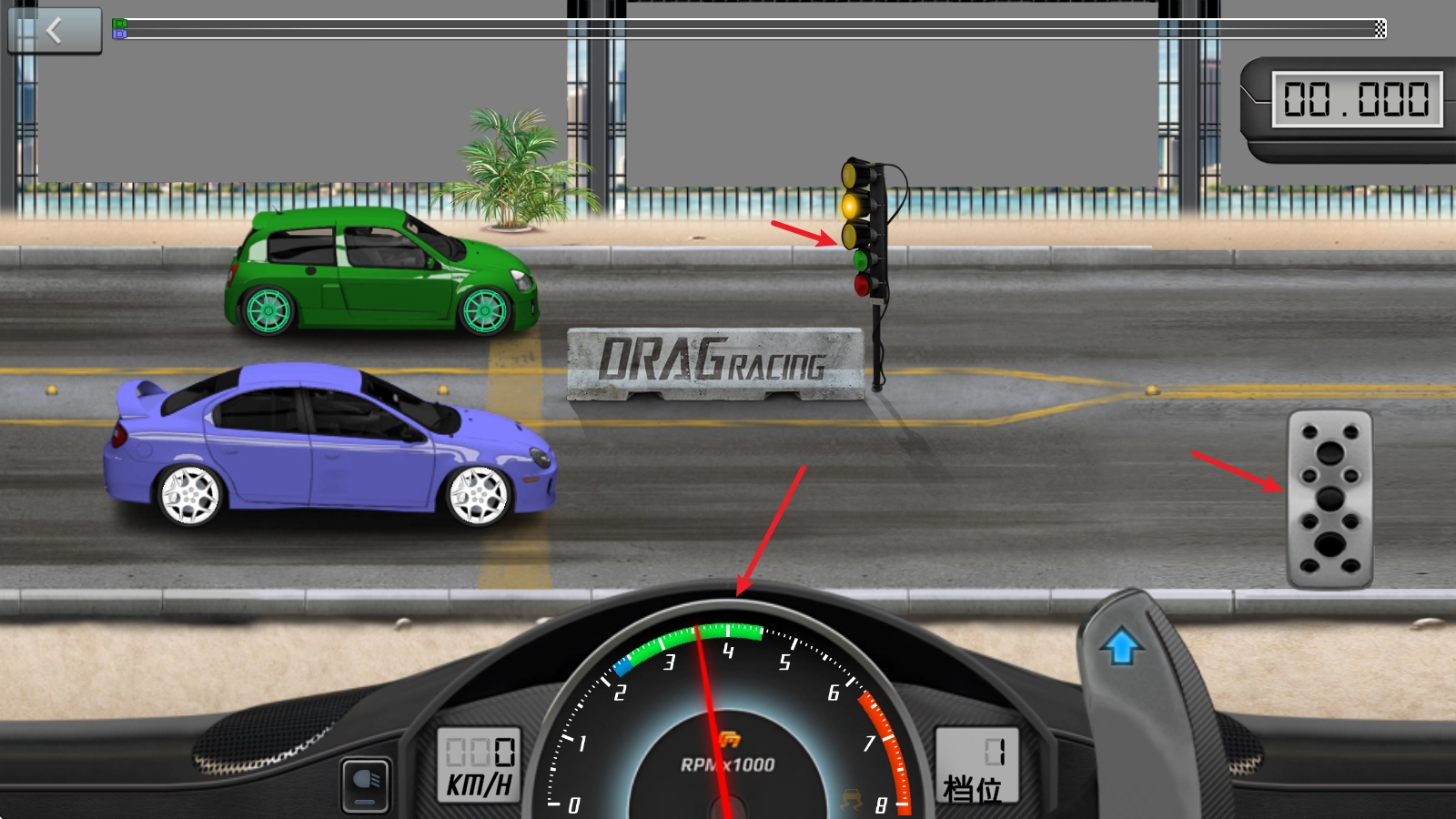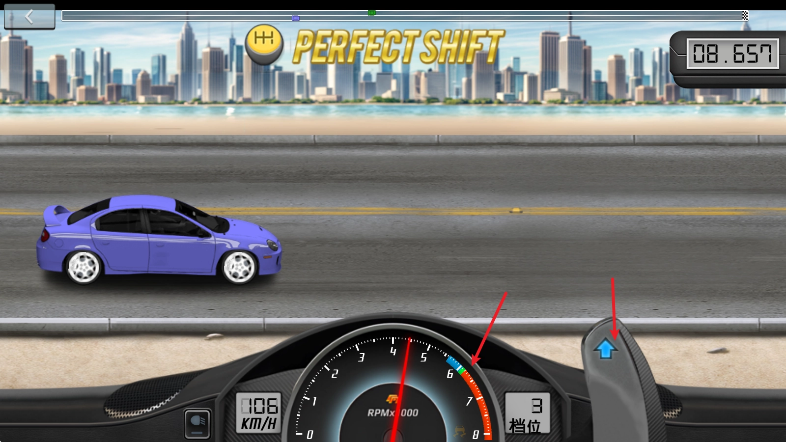 在竞速过程中,我们要做的就是通过换挡来提升速度,当速度达到绿色区域时,只需拨动旁边的按钮就能完成升档操作。
