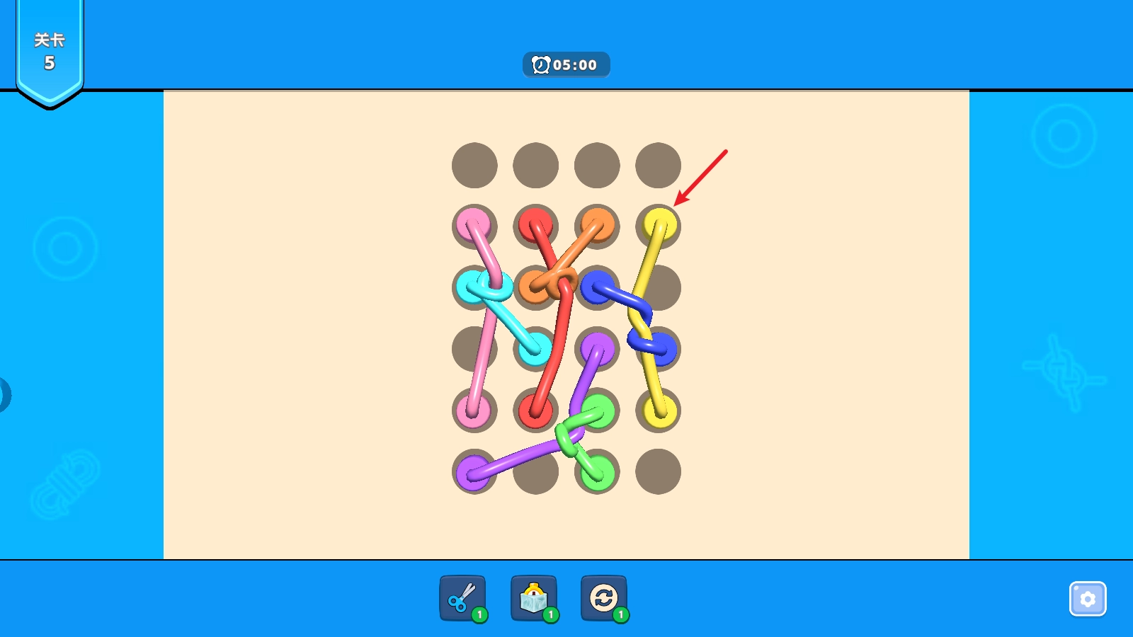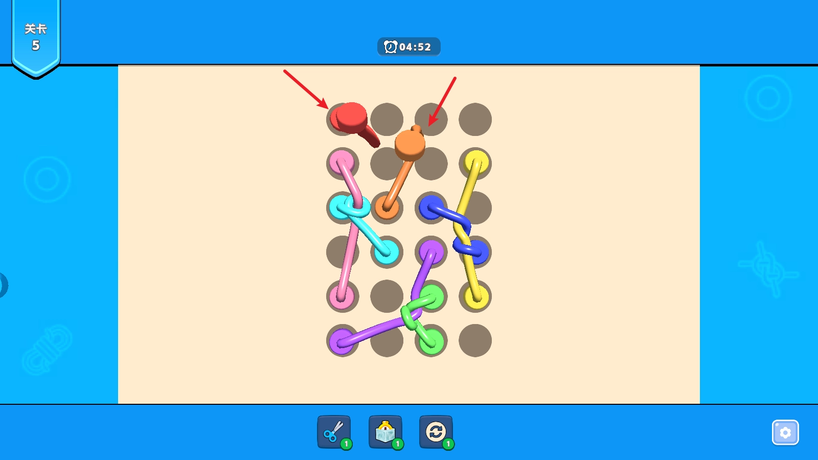 绳子消除是一款休闲益智类型的解绳解谜游戏。游戏里会出现各种色彩的绳子,它们相互缠绕在一起,玩家需要通过移动绳子两端来调整其位置,把缠绕的绳子解开并完成消除,当所有绳子都被消除后就能通关并获取奖励!另外,游戏中还配备了三种可使用的道具,能助力玩家更顺利地通过关卡!