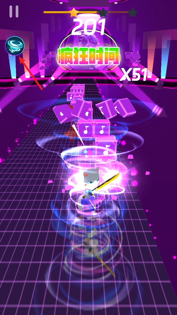 正式开始后,左右滑动屏幕就能操控猫咪移动,目标是撞击这些音符。