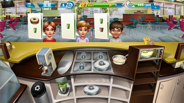 随着玩家持续解锁关卡,能获取更多新食材与道具,同时也会愈发手忙脚乱。在此小编分享一个小技巧:不少客人会选择点套餐,而套餐里只要上了其中一道食物就能延长顾客的等待时间,所以可以多准备些饮品,用来增加顾客的等待时间。