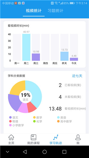 每天,软件会统计学生观看视频的情况和完成习题的数据,包括视频观看时长、完成题目数量以及涉及的学科等。此外,软件还能生成每周学习报告,使学生能够清晰地了解自己每日及每周的学习状况,从而对学生的学习起到一定的督促作用。