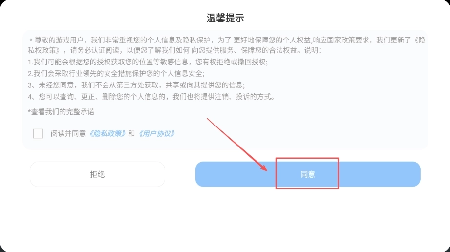 1、打开冰火人双人3d后,界面会弹出游戏协议窗口,用手指点击窗口中的同意按钮,完成协议确认才能继续后续操作。