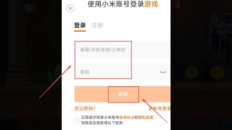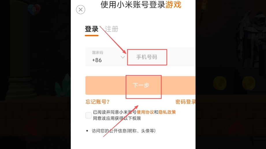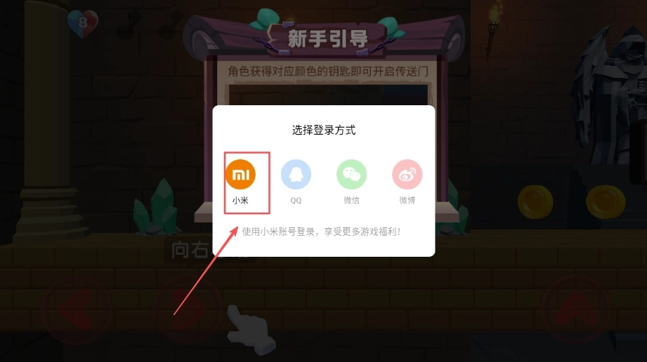 2、确认协议后进入登录选择界面,在界面中找到标有小米登录的选项,用手指点击该选项,切换到小米账号登录的页面。
