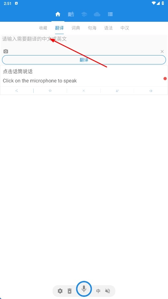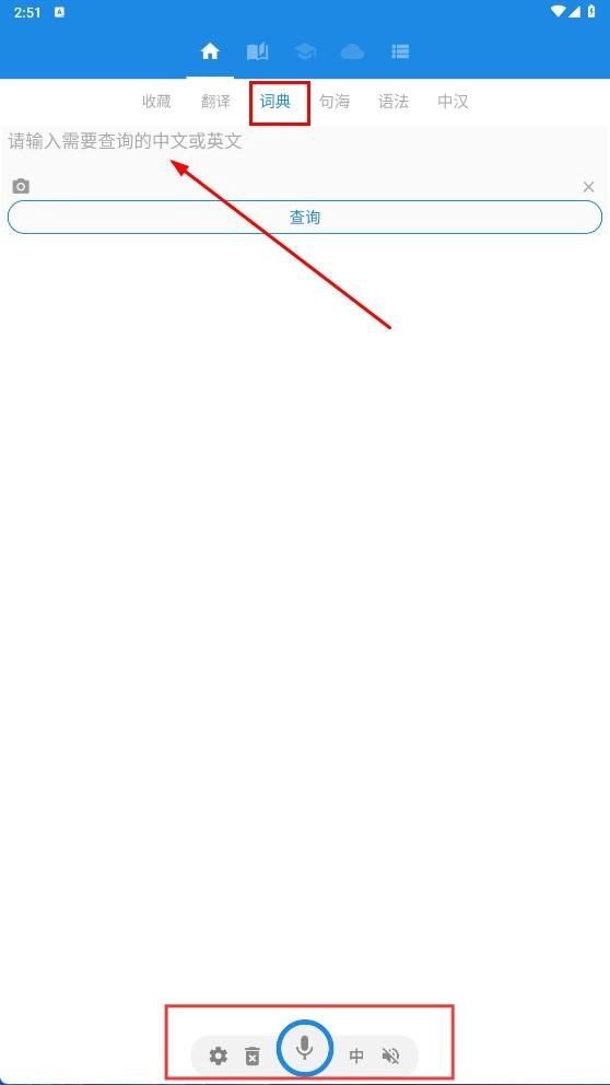 切换至【词典-功能标签】页面后,您可以在输入框中输入想要查询的中文或英文词汇进行词典查询,也可以利用页面下方的语音输入功能来完成查询操作。