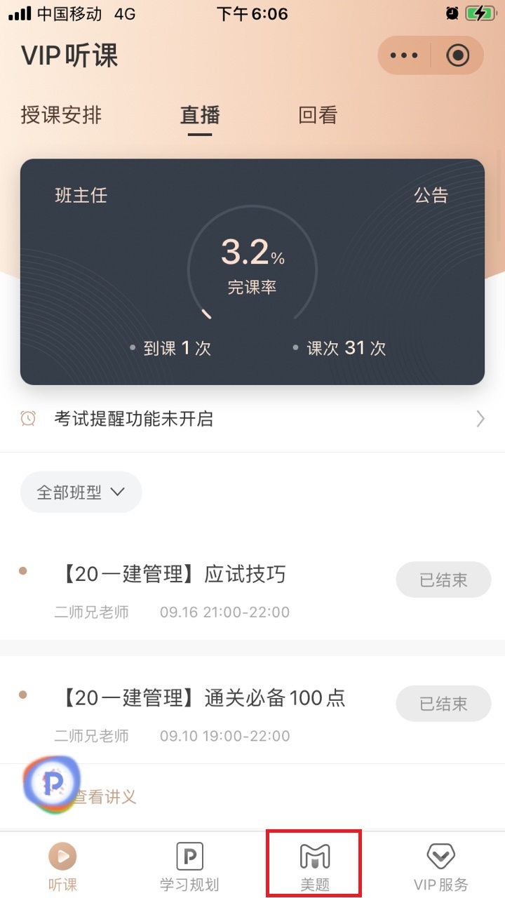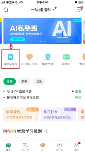 方法一:VIP学员可在您的VIP课程/班级内点击【美题】,进入题库功能