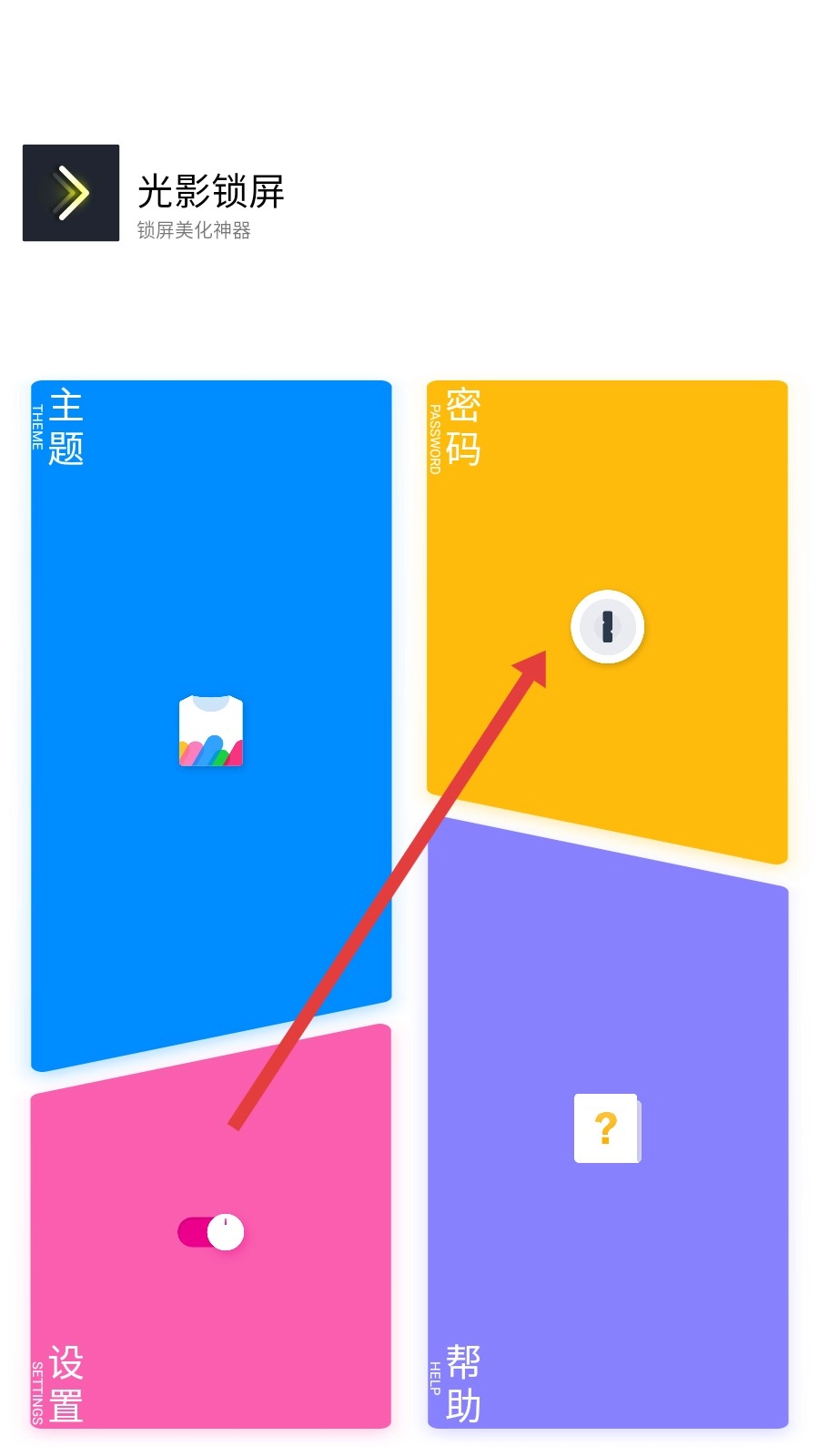 打开【光影锁屏】应用后,点击黄色的【密码】板块,即可进入密码设置界面。