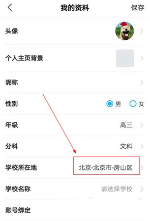 如图所示,点击“学校所在地”进入后修改地区就可以了。