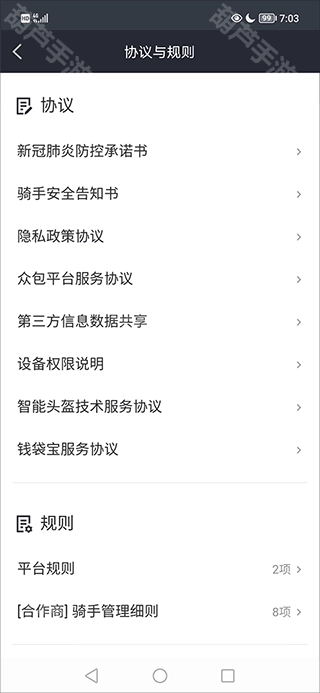 3、然后在协议与规则里找到并点击“【合作商】骑手管理细则”;
