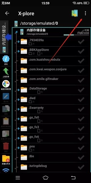 1、启动X-plore文件管理器,点击界面右上角的三点图标。